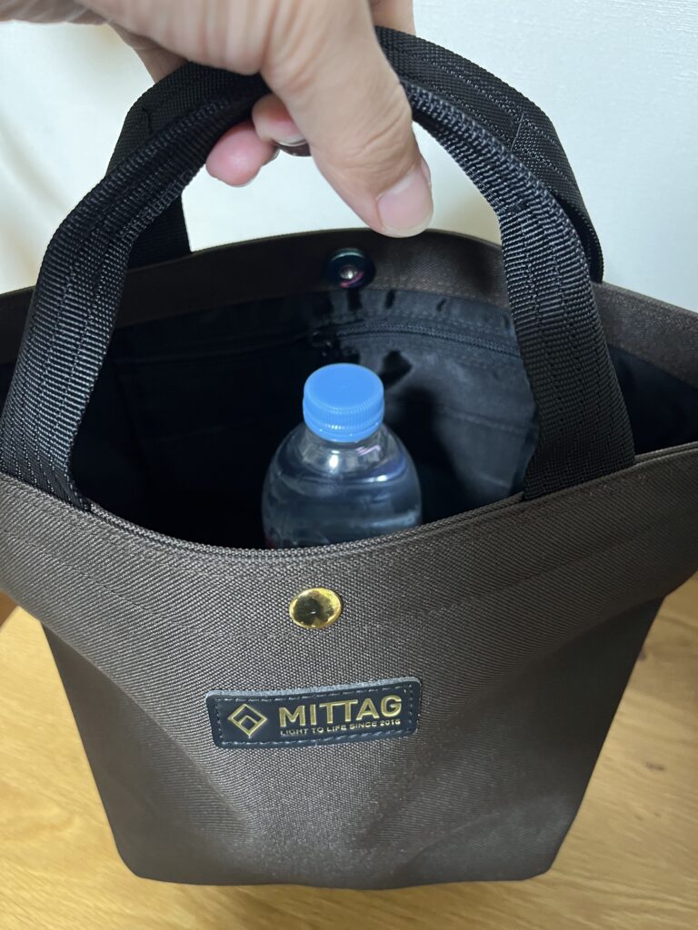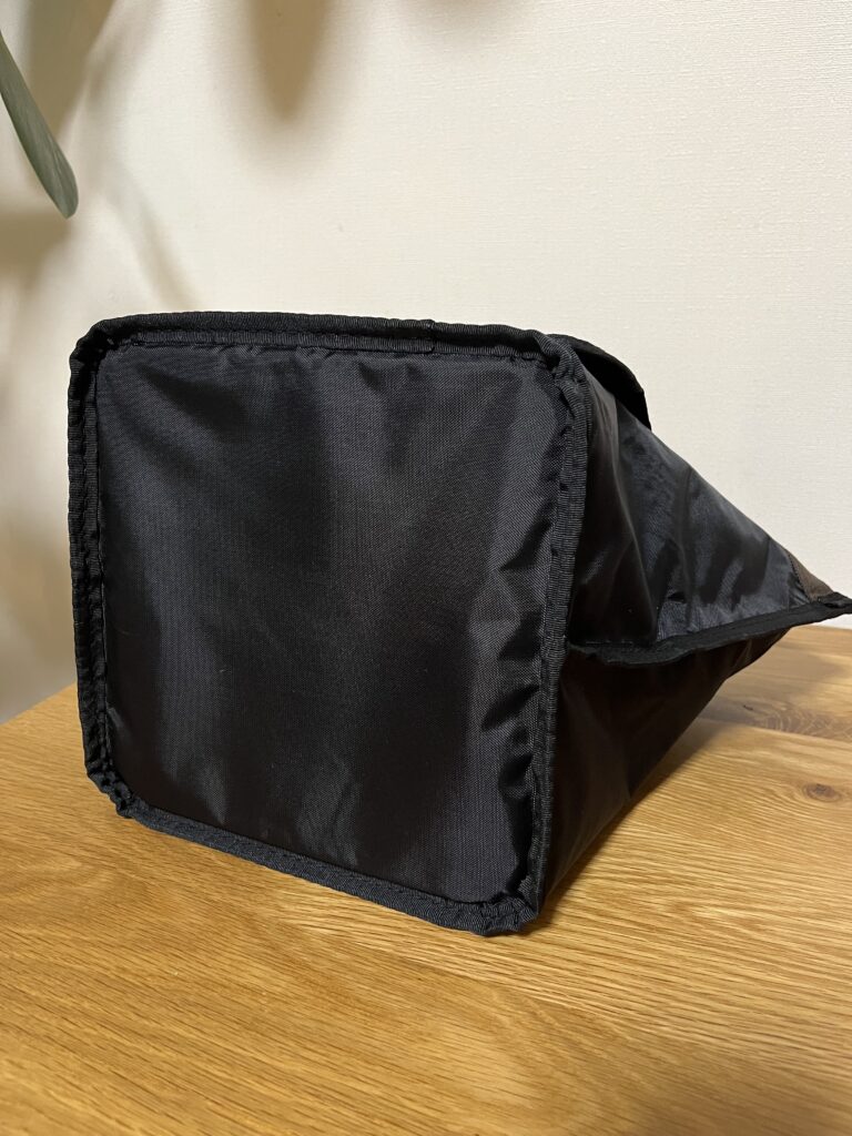 ペットボトルを入れた部分が、突起して下部からでてくることもなく、フラットな状態を保ちます。下マチの生地と生地の間に底板をいれ込むことで、カバンの内部のものを、限りなく水平に保ち持つことができます。