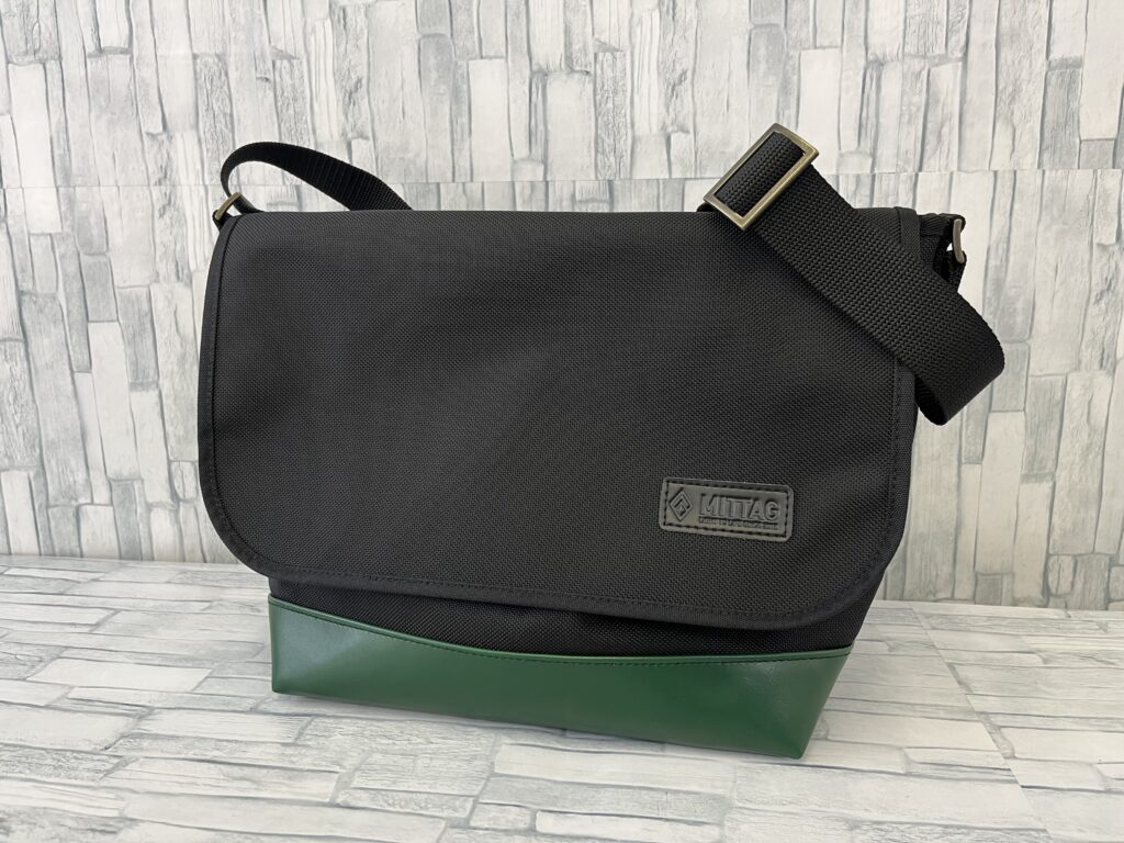 濃いグリーンのフェイクレザーになりますので、落ち着いた見た目のメッセンジャーバックに仕上がりました。