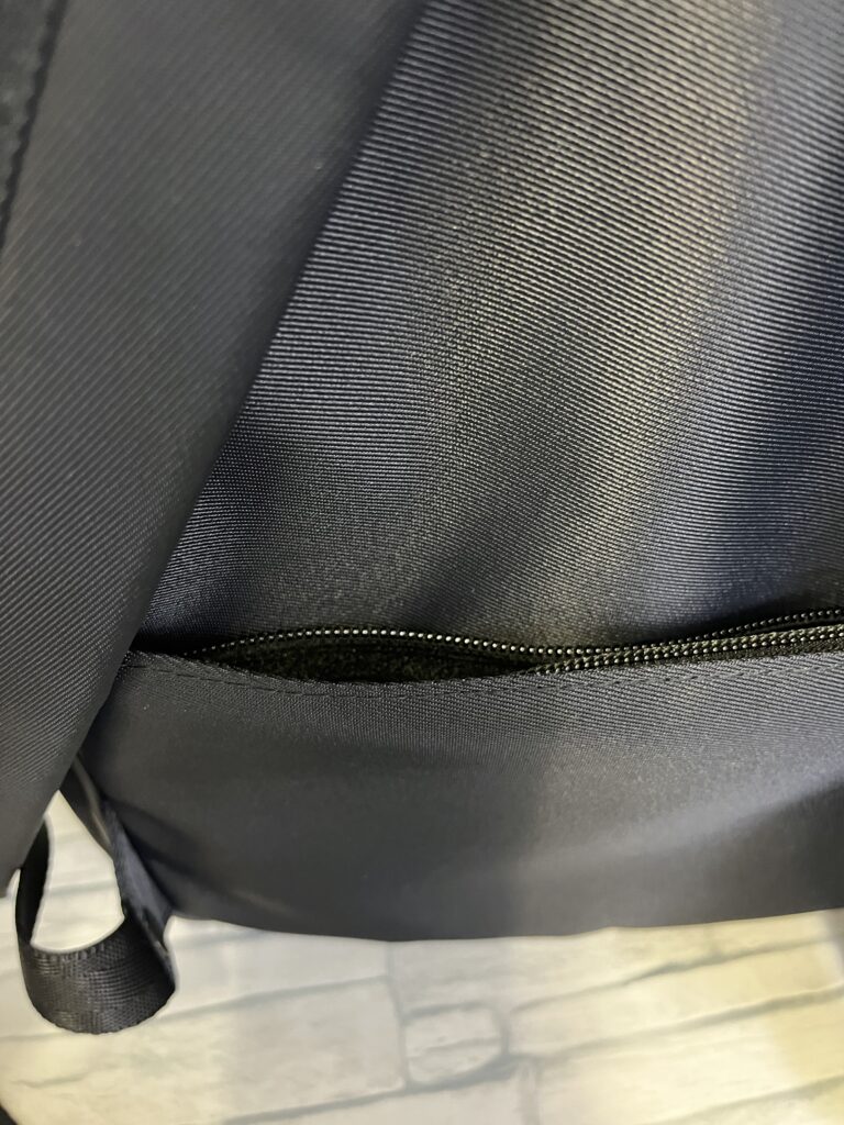 それは、フラップを開けないとものが取り出せないこと。なので、このロータスリュックは、背面に独立したファスナーポケットをとりつけています。そう、財布などの小物が入るように。これで、解決です。おまけに、背中にファスナーのコイルが当たって衣服を傷めないように生地で覆うように縫製しております。MITTAG の優しさです。