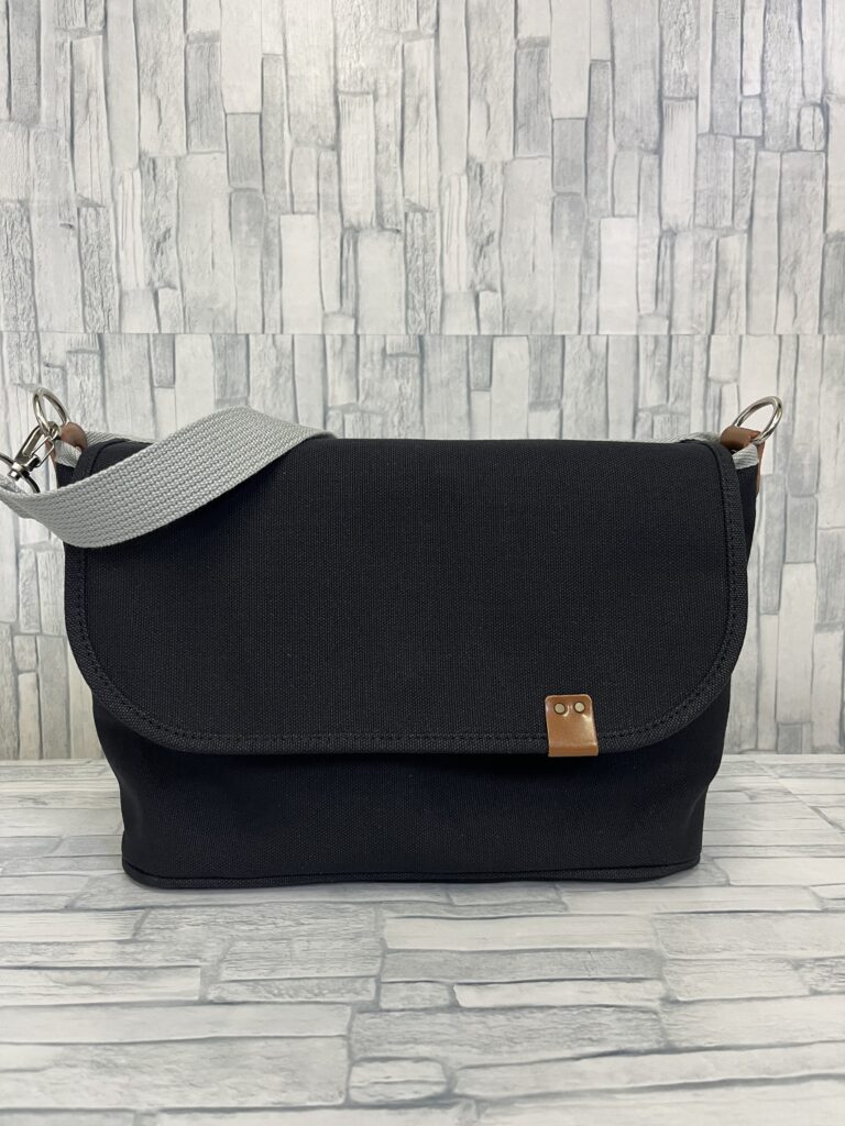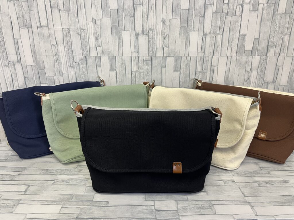 おかげさまで、ショルダーバックのカラー展開も、5色まで増えました。帆布を全面に押し出したショルダーバックにしたかったので、極力帆布のみのデザインになるように作りました。アクセントとしてフラップ部分とショルダーの付け根に、キャメルのワンポイントを取り入れました。